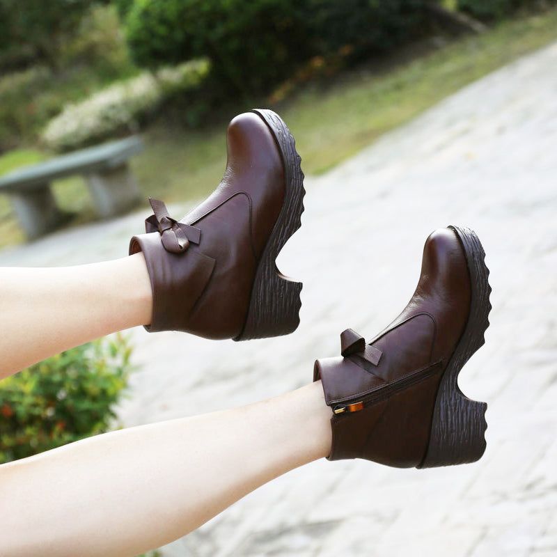 - Kvinde-sløjfe-læder retro tykhælede korte støvler