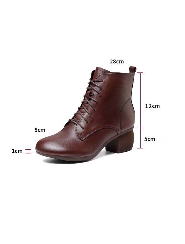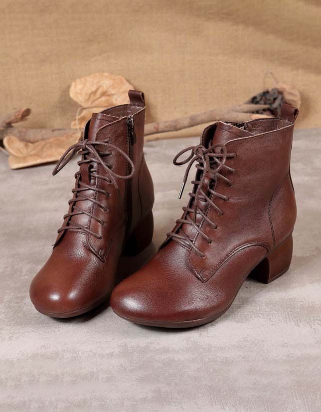 Retro Læder-snøre-støvler Med Tykke Hæle